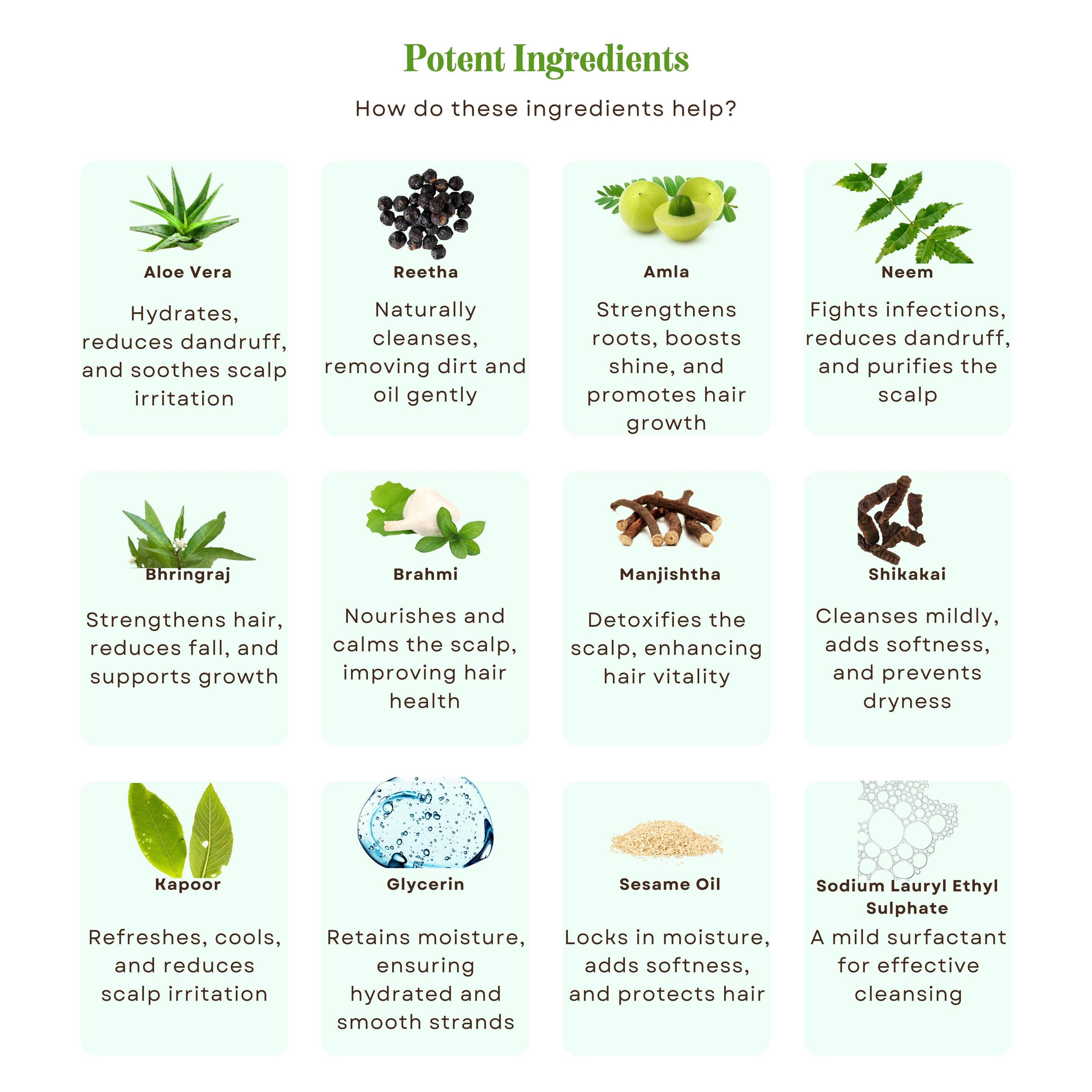 - Gentle Cleansing: Reetha and Shikakai, natural cleansers, remove dirt, excess oil, and impurities without stripping the scalp of its essential nutrients, leaving hair refreshed and clean.